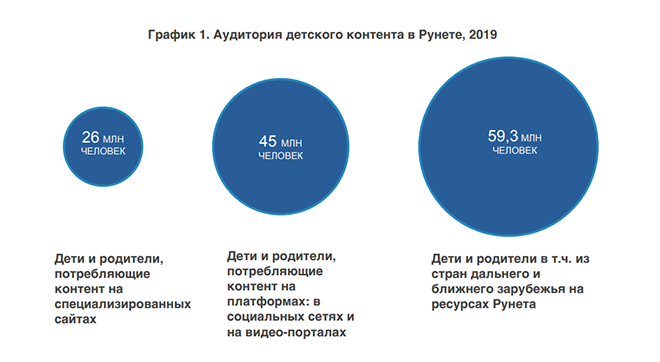 - 26 млн человек посещают сайты c детским контентом (+6,1% по сравнению с 2018 годом). На платформах, включая социальные сети и видеохостинги, потребителей детского контента 45 млн человек (+ 9,7%). Включая детей и родителей из стран ближнего и дальнего зарубежья, совокупная аудитория Детского Рунета 59,3 млн человек (+12%)