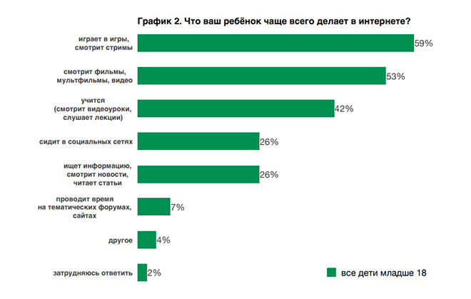 - Наиболее популярные практики у детей в интернете по мнению родителей: онлайн-игры – 59% детей, просмотр видео – 53% детей, потребление образовательного контента – 42%