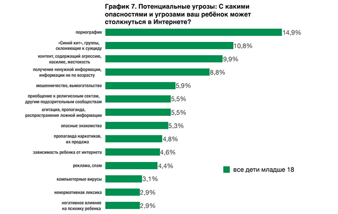 - По мнению родителей, главной угрозой для детей в интернете является порнография и эротический контент. Так считают 14,9% родителей. На втором месте среди угроз (10,8% ответов) располагается контент о суициде и так называемые “группы смерти”. На третьем месте (9,9%) контент, содержащий жестокость и агрессию