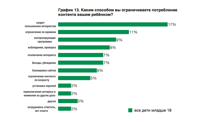 - 79,1% родителей юных интернет-пользователей ответили, что следят за тем, что их дети делают в интернете, 20% родителей не следят за действиями детей в Сети, и только около 1% затруднились ответить на этот вопрос