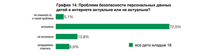 - 72,5% родителей считают актуальной проблему защиты персональных данных детей, 13,8% с этим не согласны, 8,6% не смогли ответить на данный вопрос, а чуть более 5% вообще не слышали о проблеме защиты персональных данных