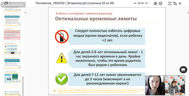 Об одной из проблем, катализатором которой может стать дистанционное образование, предполагающее постоянное использование цифровых технологий, рассказала Ирина Алборова, заведующая детским диспансерным отделением Областной психиатрической больницы №1 города Владимира. Это компьютерная зависимость. Среди самых часто встречающихся видов этой «болезни»: интернет-серфинг или блуждание по сети с целью поиска информации, не несущей глубокого смысла, зависимость от виртуального общения и от видеоигр. Психологическими проявлениями компьютерной зависимости могут быть депрессивные расстройства, повышенная тревожность, утрата интереса к учебе и общению, физическими – нарушение зрения, синдром «сухого глаза», тоннельный синдром в запястье, нарушение сна. «Один из способов профилактики компьютерной зависимости – это совместное времяпрепровождение с эмоциональной привязкой, в том числе и с использованием гаджетов, - посоветовала Ирина Алборова. – Хороший пример такого совместного досуга, когда внук учит свою бабушку пользоваться компьютером, сайтами. Это одновременно и общение, и способ отвлечься от бесцельного блуждания по сети».