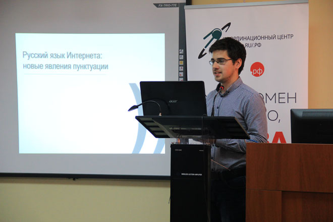Большое внимание привлекли аналитические доклады молодых ученых Пятигорского государственного университета о влиянии информационных технологий на развитие современного русского языка и особенностях, которые он приобретает при использовании онлайн. Николай Ковалев рассказал о том, как меняется лексическое значение слов в зависимости от их использования в различном контексте при общении в интернете, как появляется сетевой сленг и уникальные для сети лингвистические явления – мемы. Григорий Мхитарьян поделился результатами своего исследования в области изменения правил пунктуации и нестандартного ее использования для выражения эмоций: «С помощью знаков препинания мы всегда могли выразить возмущение (!!!), печаль (...), глубокое удивление (?!), но не могли передать улыбку. Именно поэтому в интернет-эпоху, когда львиная доля общения происходит онлайн, по сути с помощью текста, появляется еще один знак - “улыбательный”, или попросту “смайл”, круглая закрывающая скобка».